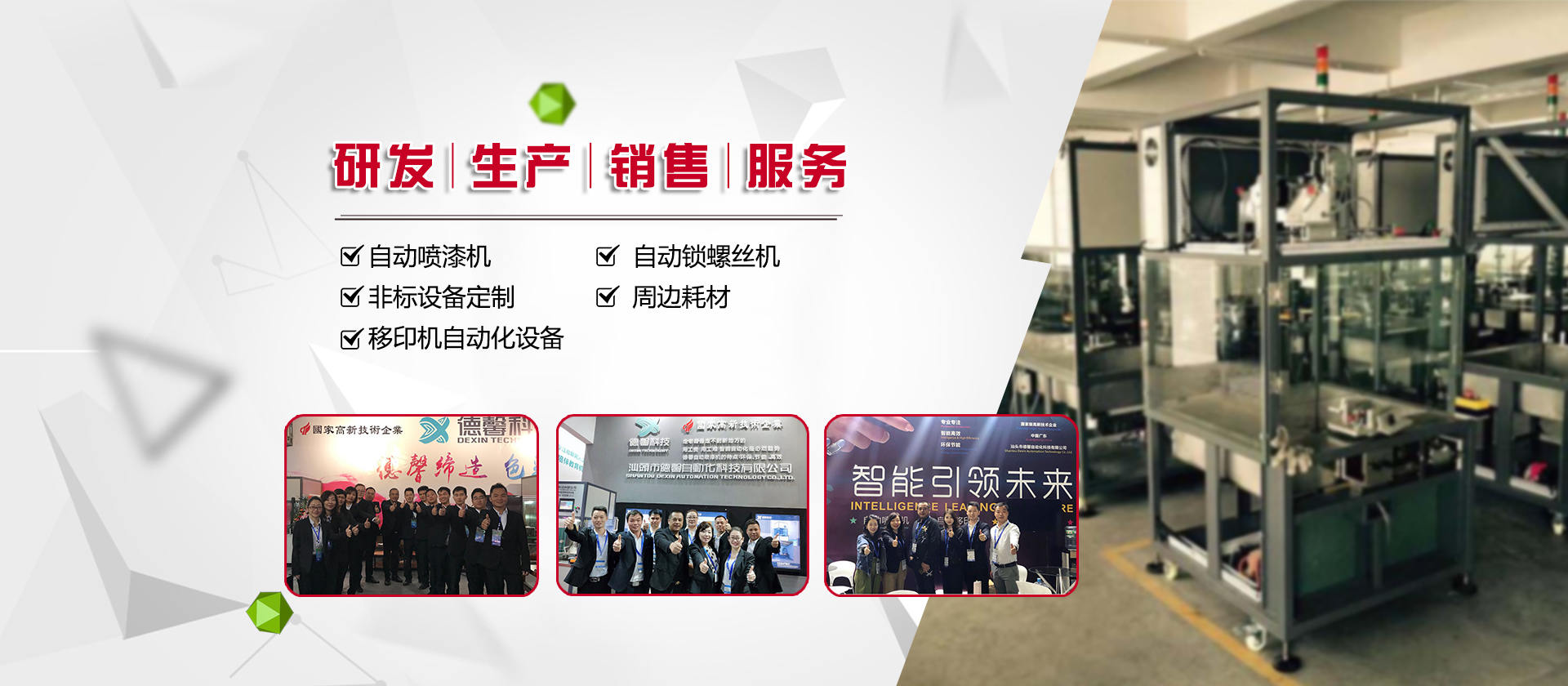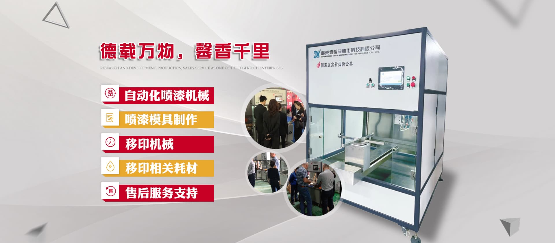 德馨科技創(chuàng)立以來,以改變噴印業(yè)傳統(tǒng)手工生產(chǎn)模式為目標,產(chǎn)品開發(fā)制造堅持以“環(huán)保、智能”為理念,為企業(yè)的生產(chǎn)環(huán)境、人力成本、生產(chǎn)效率等提供更為優(yōu)良的服務和技術支持。公司研發(fā)產(chǎn)品主要有自動化噴漆機械、噴漆模具制作等;生產(chǎn)銷售移印機械及移印相關耗材,包括菲林設計輸出;鋼板制作、移印膠頭制作、定位制作及周邊配件耗材并提供完善的售后服務支持。